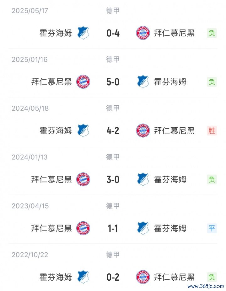 拜仁德甲3连胜积9分位列榜首;霍芬海姆2胜1负暂列德甲第6。