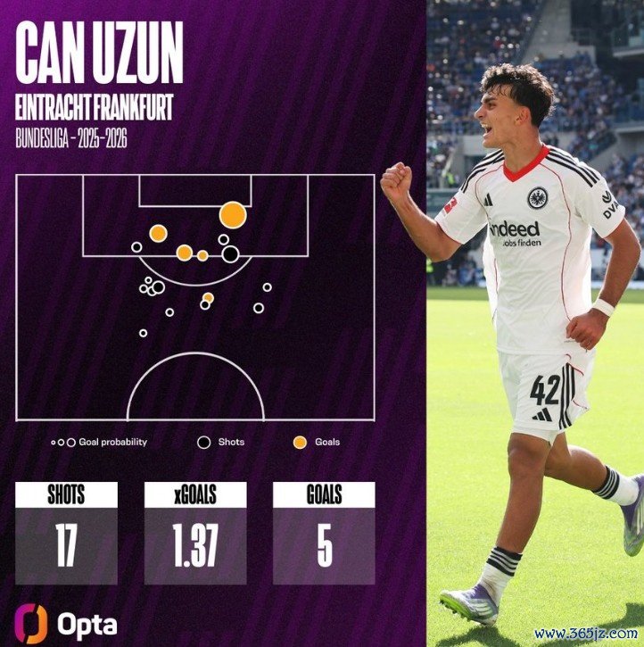 9月30日讯 本赛季法兰克福19岁小将乌尊竞技状态 出色,连续5场德甲破门,篮球新闻5场赛事 5球3助功 。