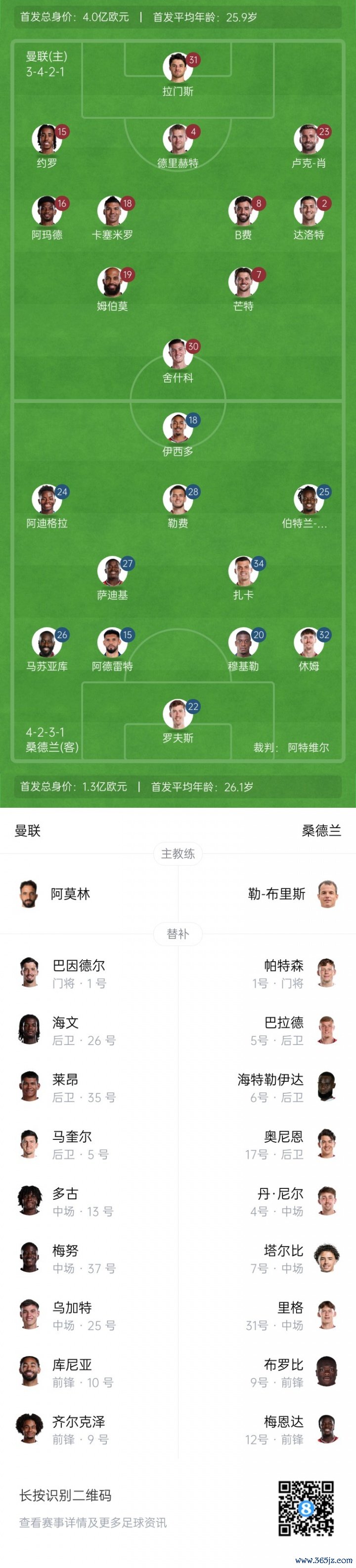 曼联杆位:31-拉门斯、2-达洛特、4-德里赫特、15-约罗、23-卢克肖、16-阿玛德、18-卡塞米罗、8-B费、19-姆伯莫、30-舍什科、7-芒特