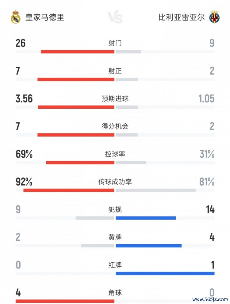 皇马vs比利亚雷亚尔数据: