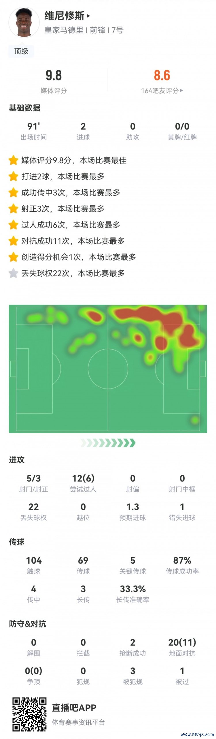 10月5日讯 本轮西甲,皇马3-1黄潜。此役维尼修斯杆位打满全场,篮球新闻足球直播吧球员全场重积分 据如下↓