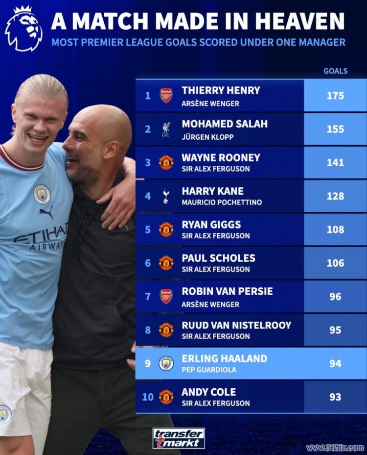 10月6日讯 近日,德国古代足球 转会网站盘点了在英超赛场单一主帅治下球员得分 榜,亨利在温格执掌下的阿森纳以打进175球傲居榜首。