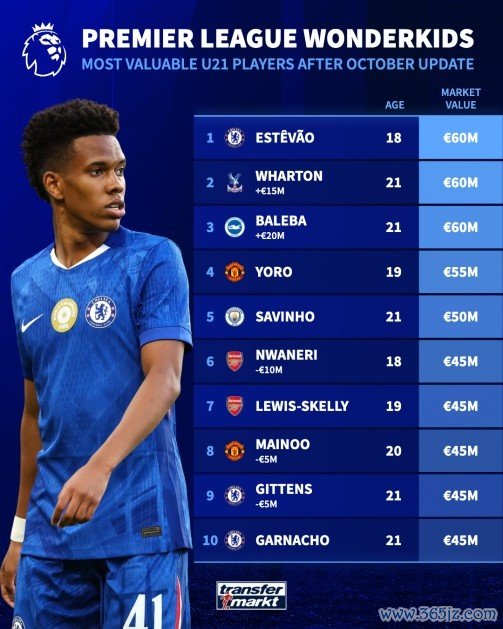 10月18日讯 德转在北京时间本月17日更新英超球员身价,同时列出了英超U21球员身价榜,埃斯特旺、亚当-沃顿、巴莱巴三人6000万欧身价最高。