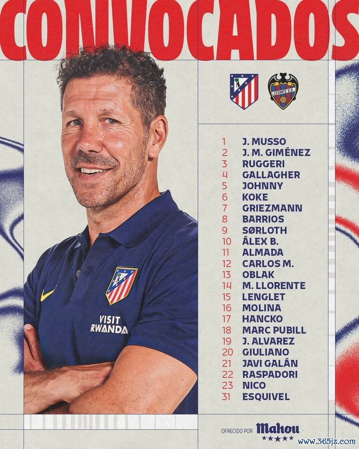11月8日讯 北京时间周日凌晨的西甲第12轮赛事 ,马竞将在主场作战 迎战莱万特。目前,篮球新闻床单军团已经公布了本场赛事 杆位阵形 , 多特蒙德西甲直播“小蜘蛛”领衔, 足球快讯朱利亚诺-西蒙尼入选。
