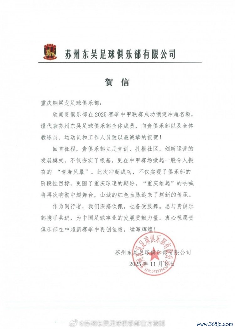 欣闻贵俱乐部在2025赛季中甲职业联赛 成功锁定冲超名额,谨代表苏州东吴古代足球 俱乐部全体成员,向贵俱乐部以及全体指导教练员员、运动活动 员和工作人员致以最诚挚的祝贺!