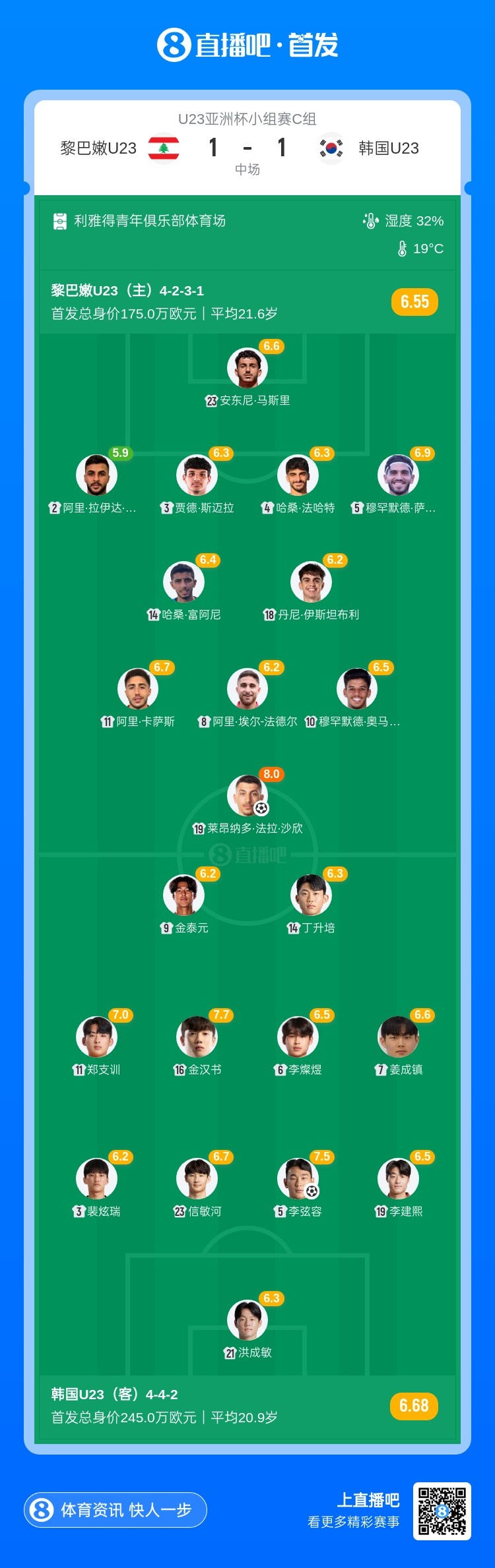 1月10日讯 北京时间19:30,U23亚洲杯小组赛C组黎巴嫩U23vs韩国U23。上半场,莱昂纳多·法拉·沙欣帮助黎巴嫩U23率先破门;随后韩国U23利用底线球机会,由李弦容扳平比分!半场结束西甲金靴,篮球新闻韩国U23暂1-1黎巴嫩U23。