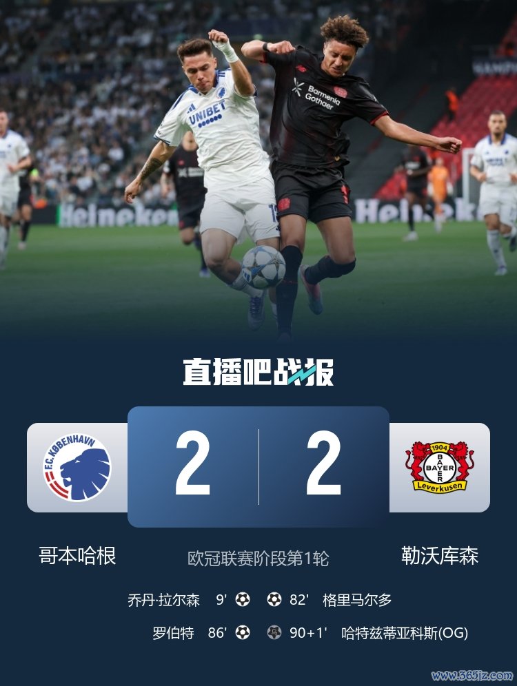 欧冠-勒沃库森2-2哥本哈根 埃切维里造绝平乌龙格里马尔多破门