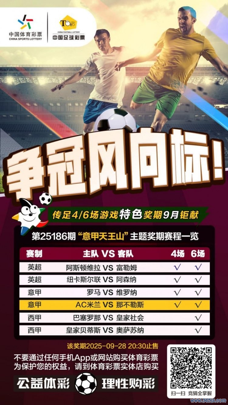 第25186期传足4/6场游戏特色奖期已经于2025年9月24日20:00开售皇马11-1巴萨,将于2025年9月28日20:30停售,并于9月29日开奖,其中阿斯顿维拉VS富勒姆、纽卡斯尔联VS阿森纳、罗马VS维罗纳、AC米兰VS那不勒斯为4场得分 游戏竞猜赛事。