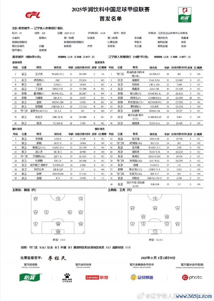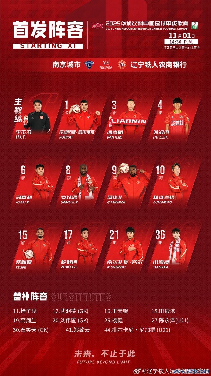 中甲第29轮,南京城市vs辽宁铁人杆位名单!
