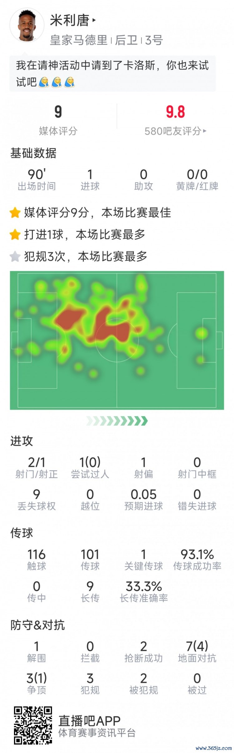 9月21日讯 在本轮西甲,皇马2-0击败西班牙人。本场比赛米利唐打进惊天远射,篮球新闻法甲直播以下为他在本场数据: