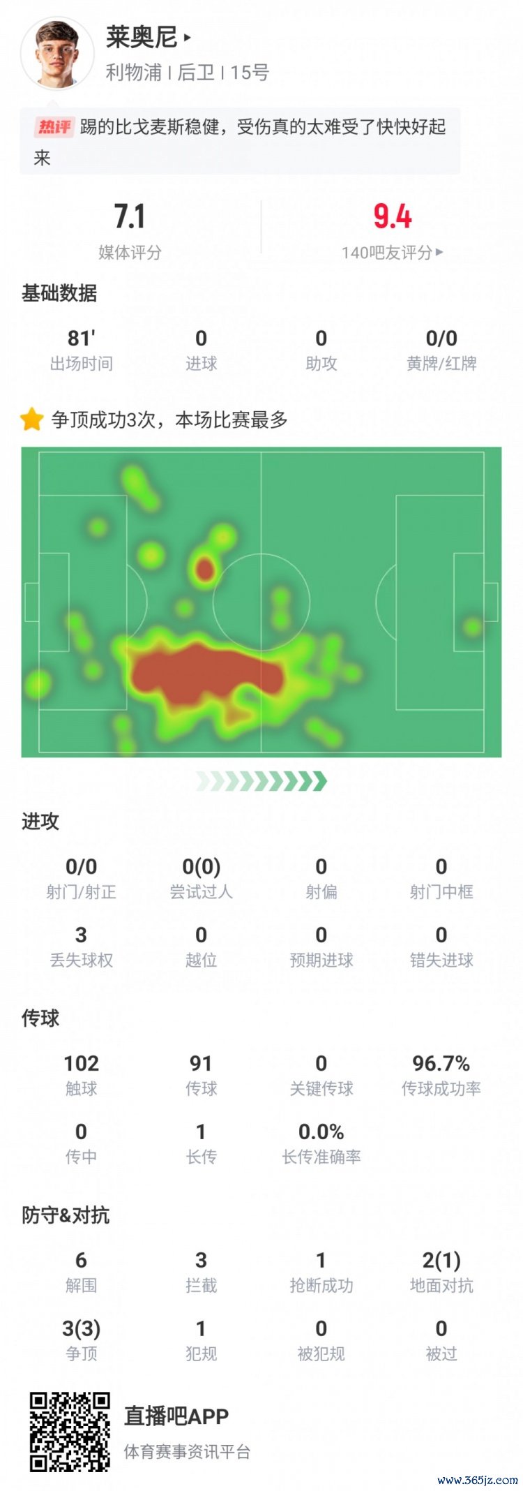 莱奥尼的传球成功率高达96.7%, 足球快讯在防守端贡献6次解围、3次拦截、1次抢断、3次争顶全都成功英超赛程2425升级球队,他也是全场争顶成功次数最多的球员。