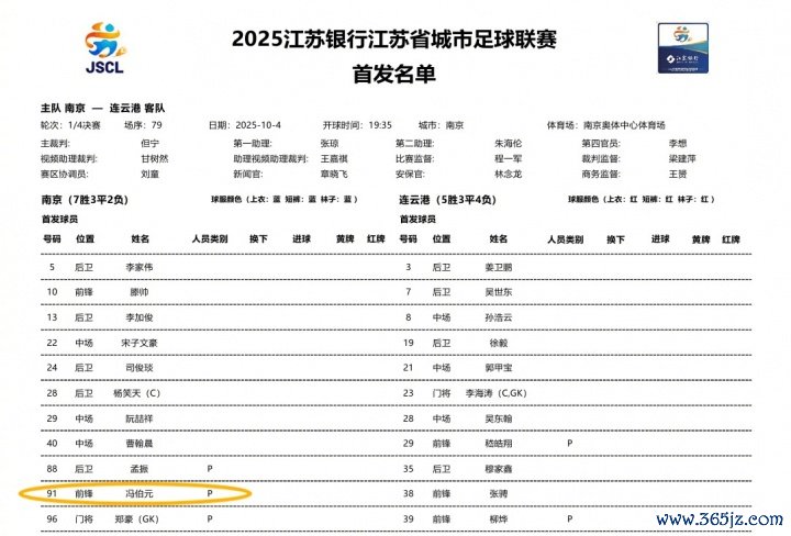 10月04日讯 “苏超”首场1/4淘汰赛,南京队对阵连云港队的首发已经公布,其中南京队派出了现效力于青岛海牛队的冯伯元首发出场。