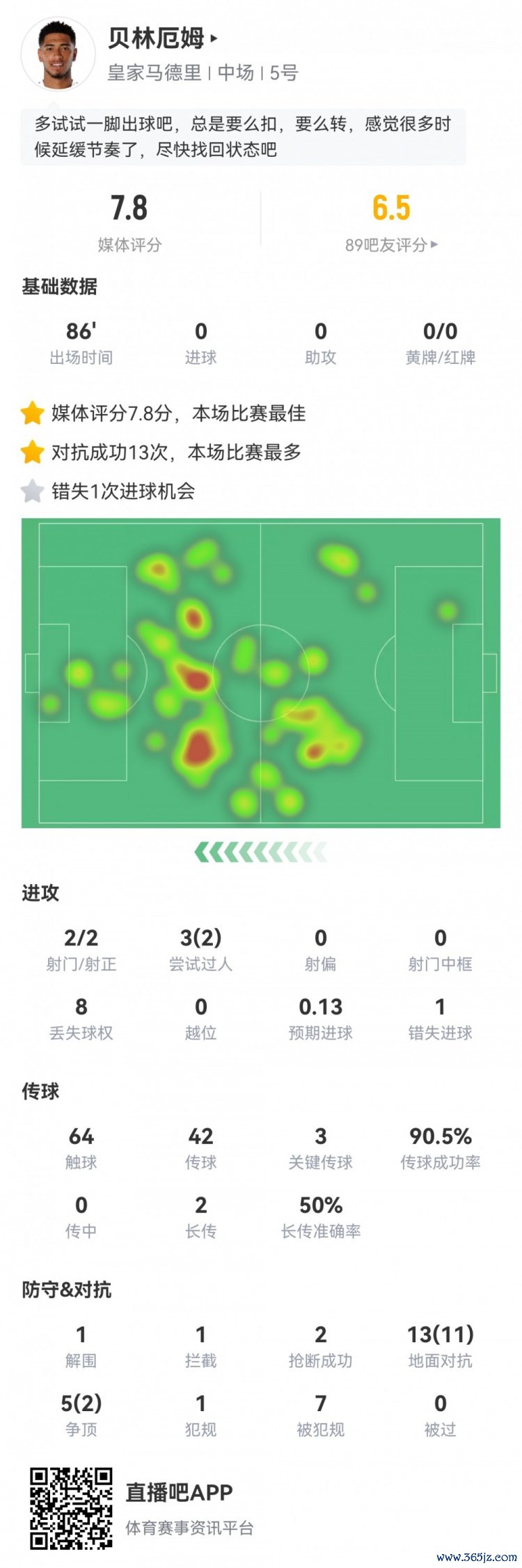 10月20日讯 本轮西甲,皇马1-0赫塔费。此役贝林厄姆首发86分钟, 多特蒙德足球直播球员全场重点数据如下↓