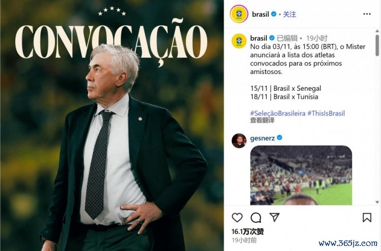 10月23日讯 据巴西国家队社媒账号发布的消息,该队下一期的集训名单将于11月3日公布,篮球新闻下个月国际比赛日巴西将与塞内加尔、突尼斯两队踢友谊赛, 多特蒙德足球直播吧为明年世界杯热身并进一步考察球员。
