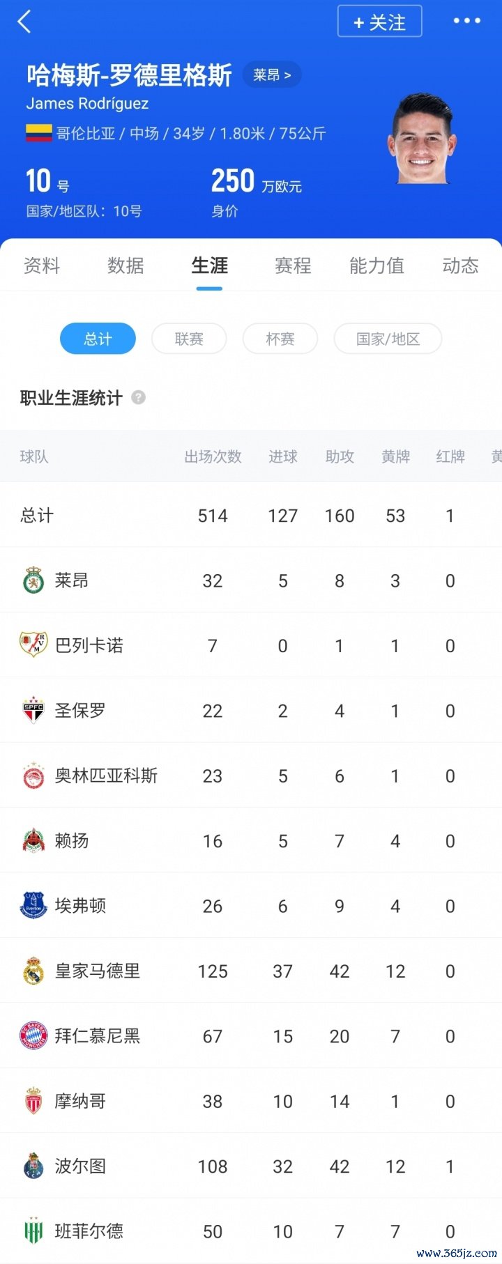 现年34岁的J罗,生涯曾效力皇马、摩纳哥、拜仁、埃弗顿等队,巅峰身价曾达到8000万欧,如今身价仅剩250万欧。