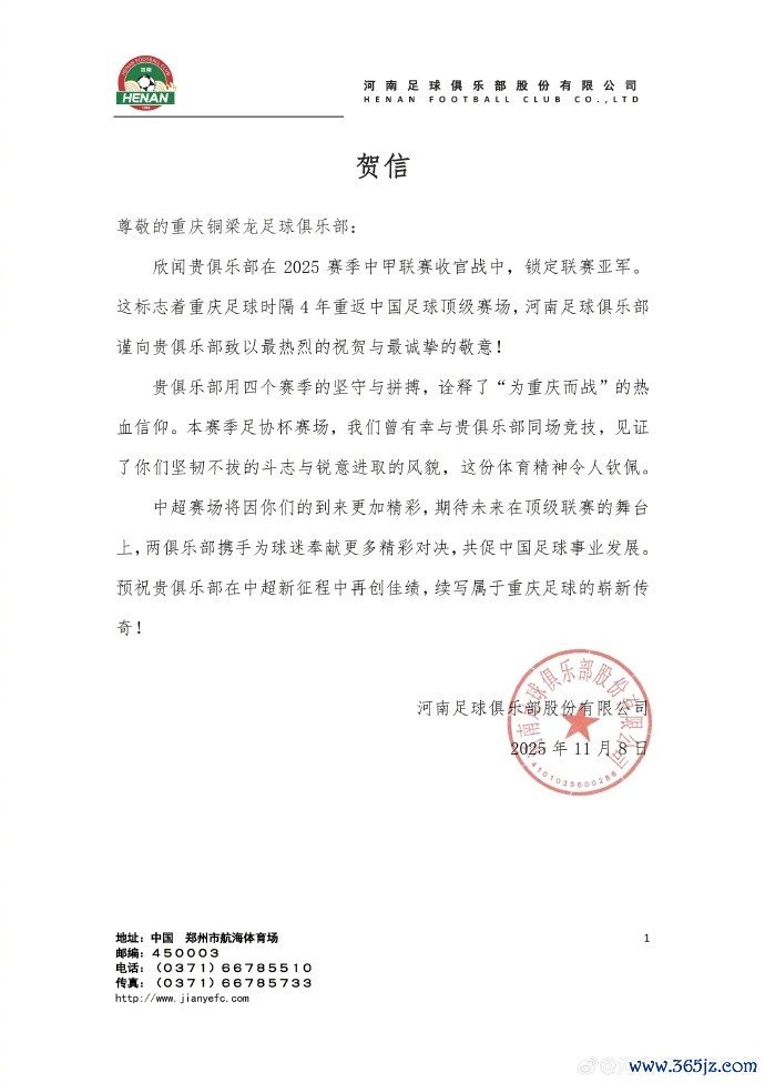 欣闻贵俱乐部在2025赛季中甲联赛收官战中,锁定联赛亚军。这标志着重庆足球时隔4年重返中国足球顶级赛场,河南足球俱乐部谨向贵俱乐部致以最热烈的祝贺与最诚挚的敬意!