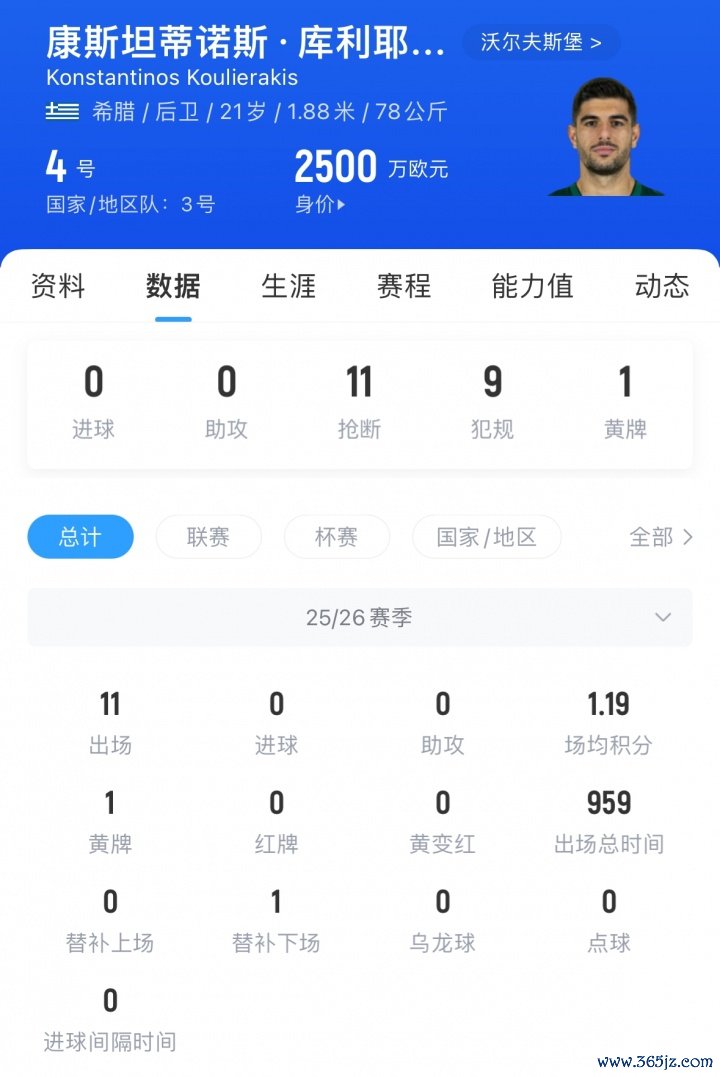 库利耶拉基斯现年21岁,是一名左脚中卫,他去年夏天加盟沃尔夫斯堡,本赛季已为球队出场11次,现身价2500万欧。