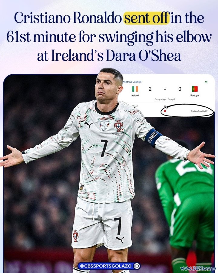 C罗因暴力行为被VAR审查后罚下, 多特蒙德他将错过葡萄牙在2026世界杯的首场比赛。