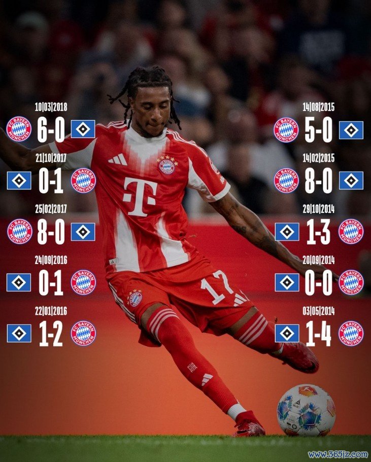 9月13日讯 本轮德甲拜仁对汉堡的赛事 即将打响,拜仁官推也晒出双方近10次对阵战绩。