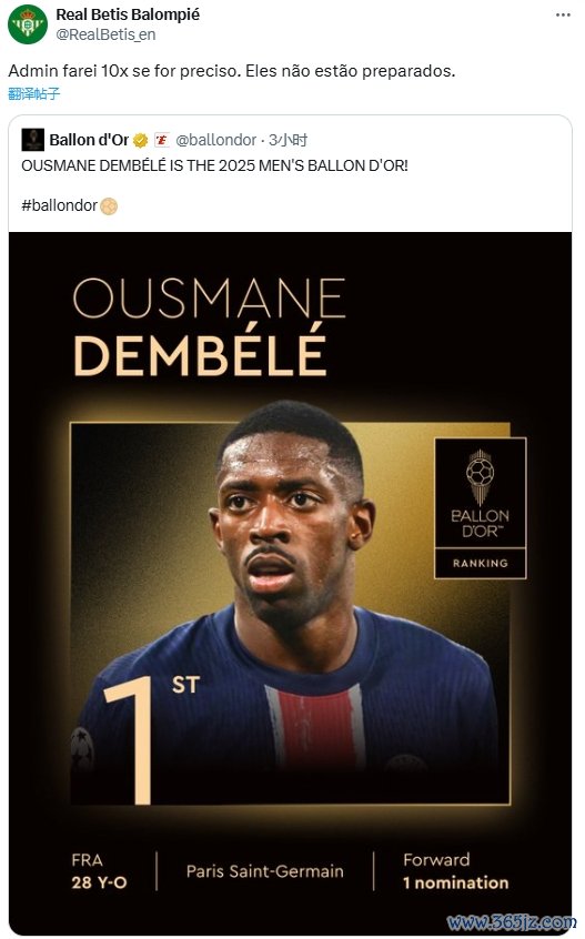 09月23日讯 2025金球奖由巴黎球员登贝莱斩获,贝蒂斯转发球员 员获奖的动态并表示:若有必要小编我会发十遍,篮球新闻他们还没准备好。