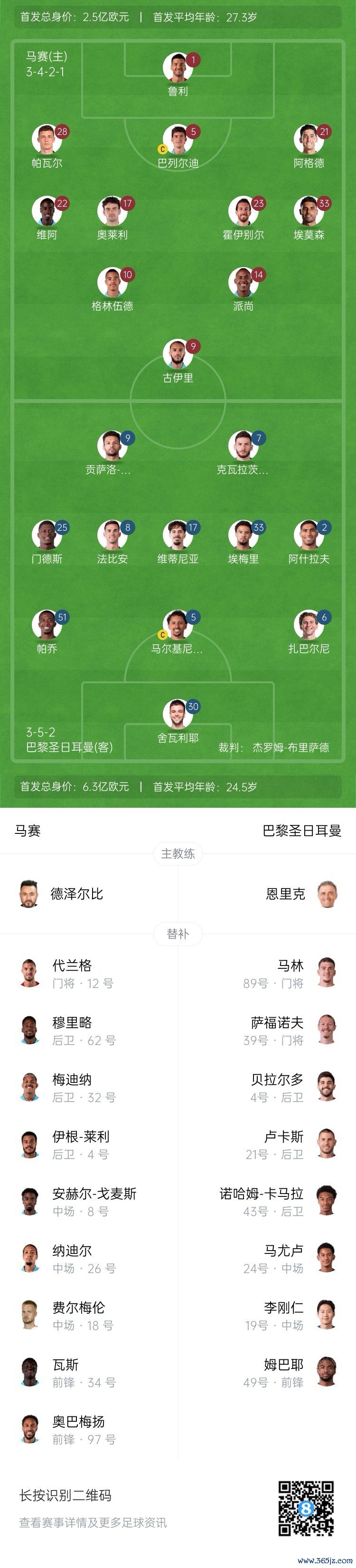 马赛后备 :12-代兰格、4-伊根-莱利、32-梅迪纳、62-迈克尔-穆里略、8-安赫尔-戈麦斯、18-费尔梅伦、26-纳迪尔、34-瓦斯、97-奥巴梅扬