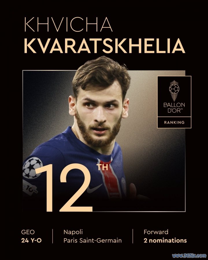 9月23日讯 2025年金球奖排名陆续公布,克瓦拉茨赫利亚获得第12名,生涯第二次提名。