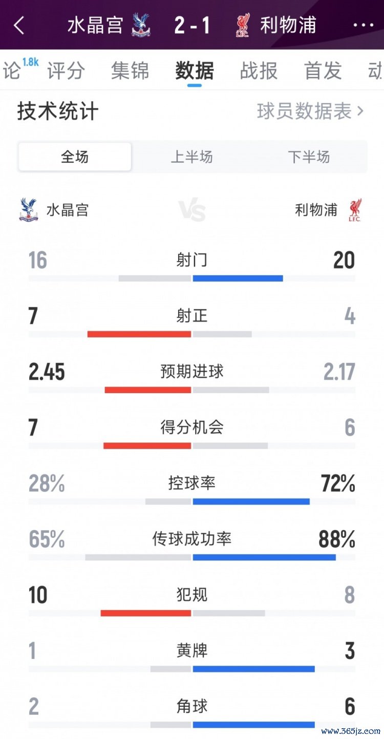 9月28日讯 在本轮英超,篮球新闻西甲直播利物浦1-2不敌水晶宫。以下为双方全场数据对比: