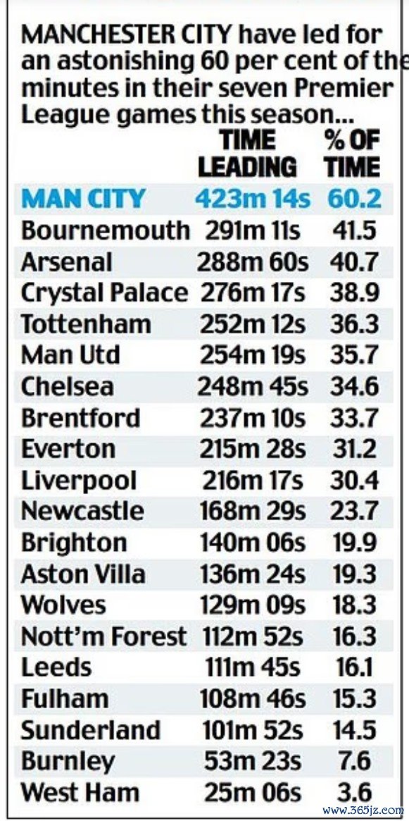 10月6日讯 英超7轮赛事 之后,阿森纳暂时在积分榜上位居榜首,前四其他三支球队分别为利物浦、热刺和伯恩茅斯。《每日邮报》盘点了英超20队在前7轮的领跑 时间情况。