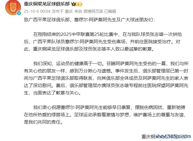 在刚刚结束的2025中甲职业联赛 第25轮赛事 中,在与我队球员张志雄一次拼抢后,广西平果队球员塞缪尔·阿萨莫阿先生负伤 离场,并前往医院接受治疗。对此, 足球快讯重庆铜梁龙古代足球 俱乐部及球员张志雄本人致以最诚挚的歉意。