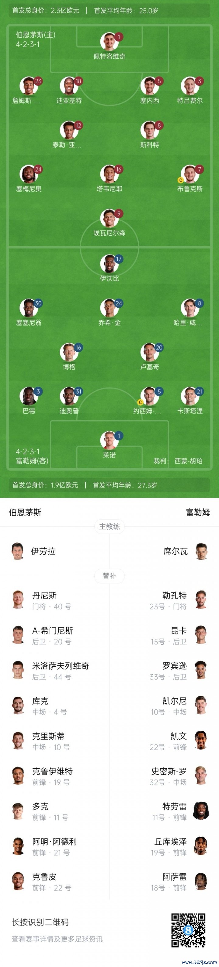 伯恩茅斯后备 :40-丹尼斯、20-阿莱克斯·希门尼斯、44-米洛萨夫列维奇、4-库克、10-克里斯蒂、11-多克、19-克鲁伊维特、17-阿明·阿德利、22-克鲁皮