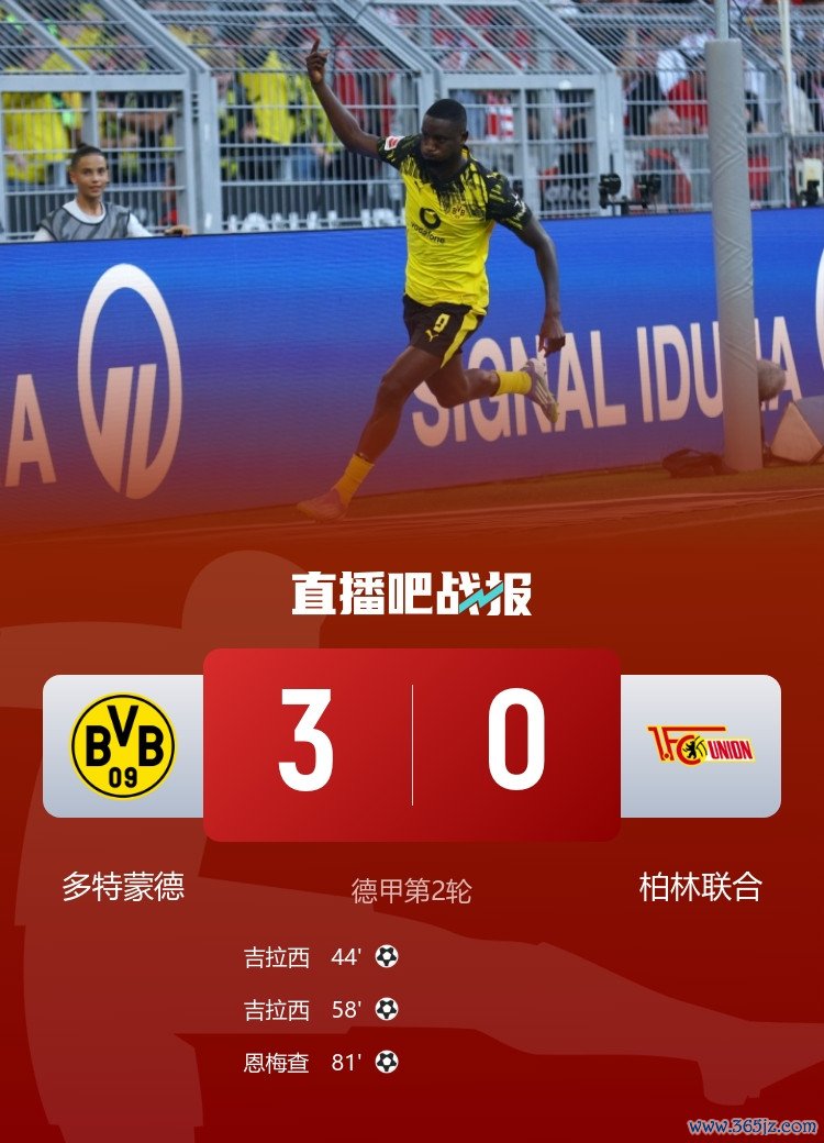 直播吧9月1日讯北京时间8月31日23点30分今日足彩竞彩,德甲第2轮,多特蒙德在主场作战 伊杜纳信号公园运动活动 场 迎战柏林联合。上半场,吉拉西单刀赴会被扑后抢点打进一球。下半场,吉拉西完成双响,恩梅查后备 建功。最终多特蒙德3-0击败柏林联合,取得赛季首胜。