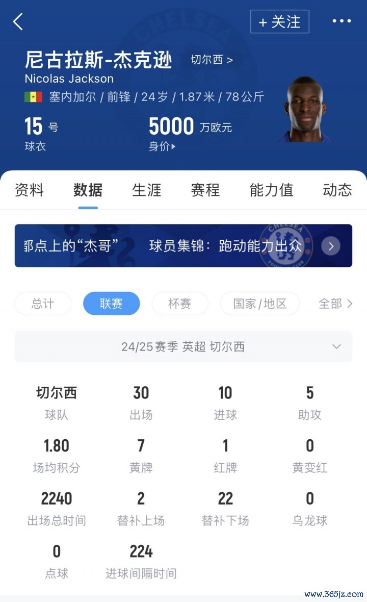 杰克逊现年24岁,目前德回转 价5000万欧,切尔西2023年花费3700万欧从比利亚雷亚尔将其引进。上赛季杰克逊为切尔西出战38场收获16球5助。