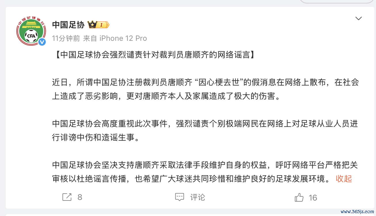 近日,所谓中国足协注册裁判 员唐顺齐“因心梗去世”的假消息在网络上散布,在社会上造成了恶劣影响,篮球新闻更对唐顺齐本人及家属造成了极大的伤害。