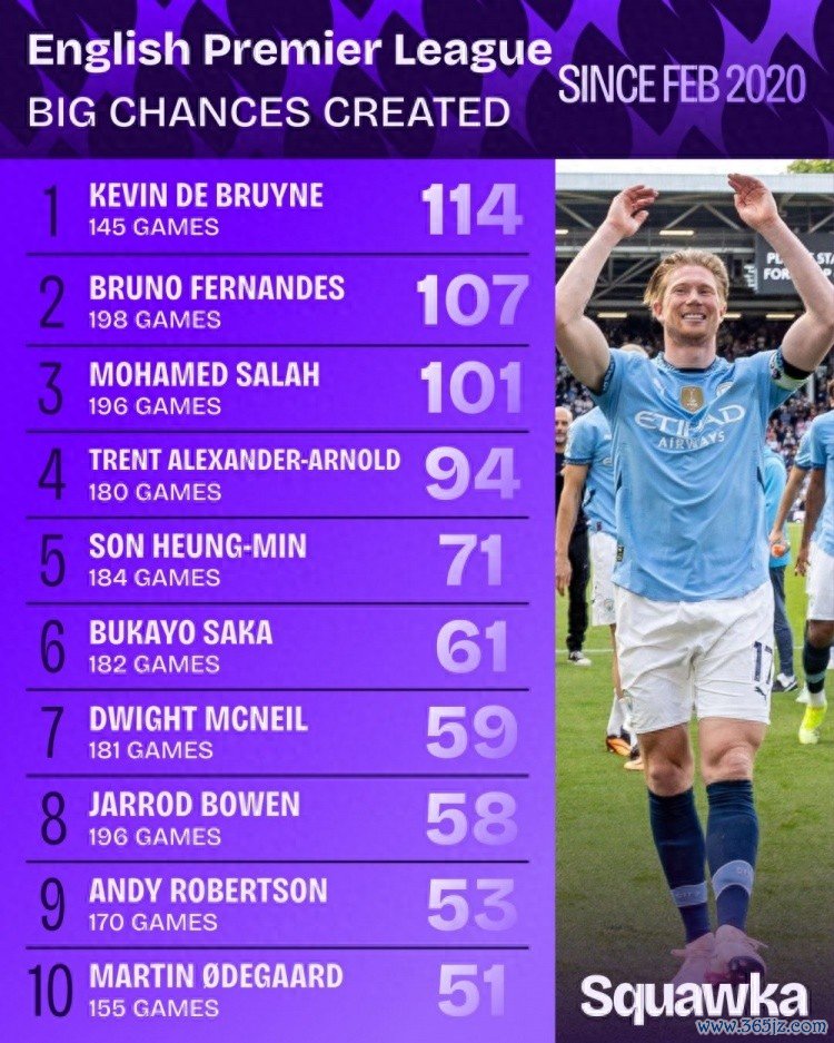 直播吧9月7日讯 squakwa统计了自B费加盟曼联以来的英超同期创造重大机会情况,足球直播吧数据统计 显示B费仅次于德布劳内。