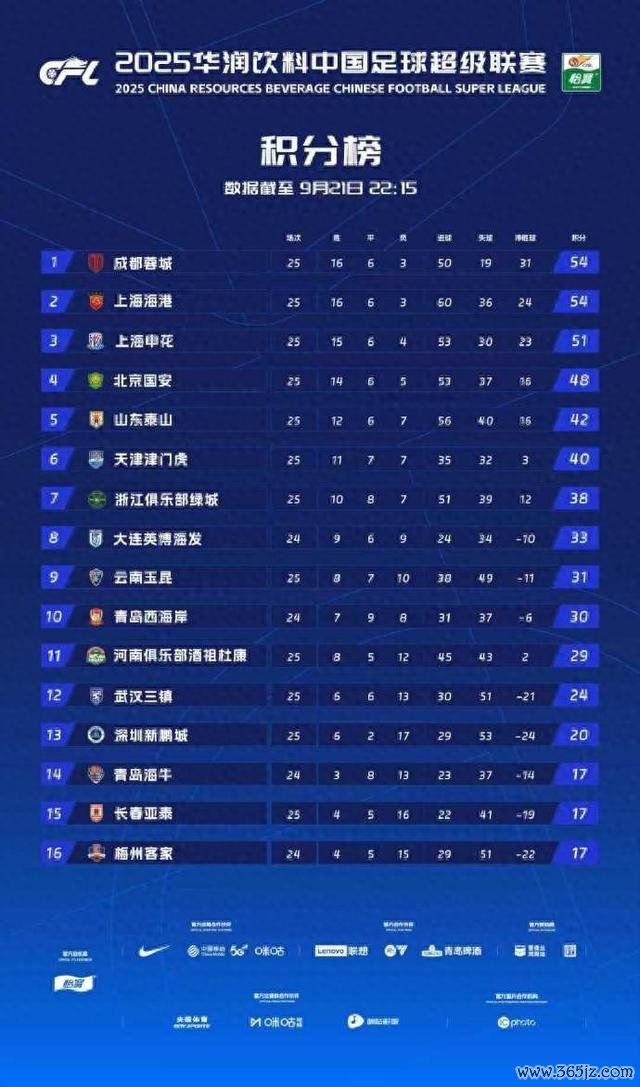 其中,争冠四强直接对决。成都蓉城队在客场应战 1比1绝平上海申花后,继续留在榜首,但他们也仅比排在第三的申花队多3分。至于保级形势,更为胶着。本轮过后,青岛海牛、长春亚泰和梅州客家队都是17分,积分垫底。