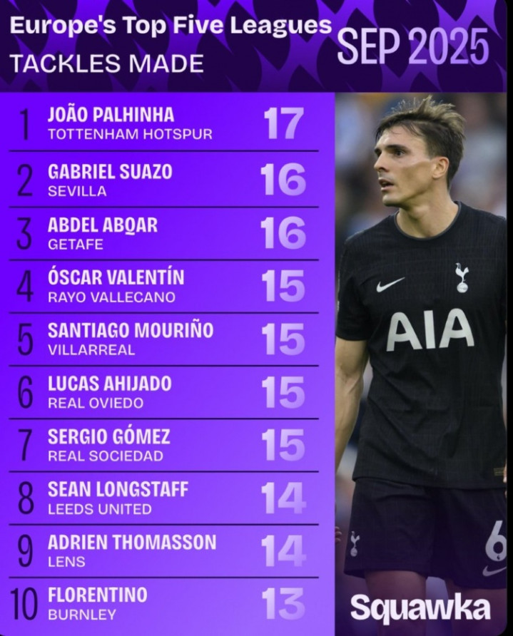 直播吧10月1日讯今天,数据机构Squawka在社媒公布了九月份铲球榜,篮球新闻西甲直播热刺中场球员帕利尼亚以17次成功铲球位居榜首。