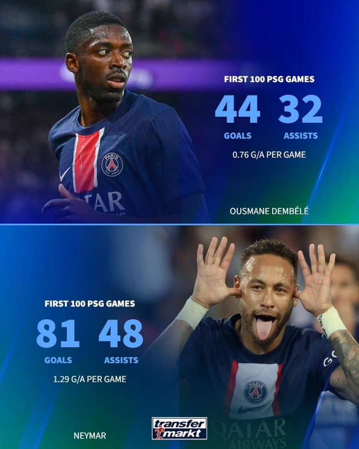 虎扑10月22日讯登贝莱迎来了巴黎生涯的百场里程碑,德国转会市场对比了他与其他几位效力过巴黎的球星——在100场时的数据。
