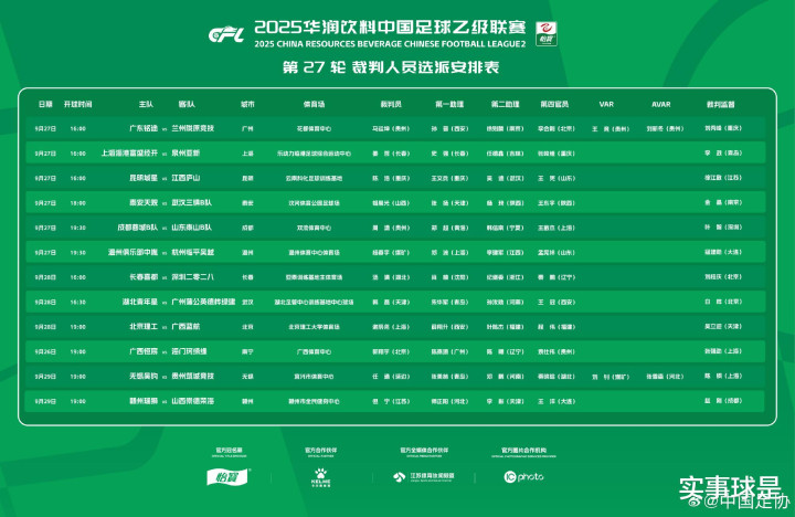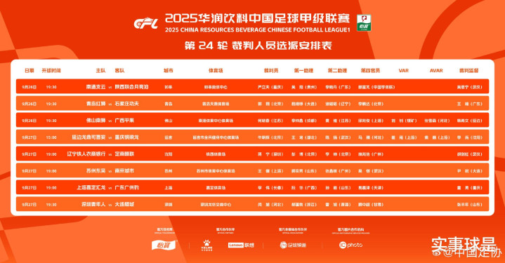 9月26日,就在2025赛季中超第26轮打响时,本赛季中甲第24轮、中乙第27轮,也激战正酣。其中,4场涉及冲超(冲甲)和保级的赛事 足球竞彩网,还安排了视频裁判 (VAR)。